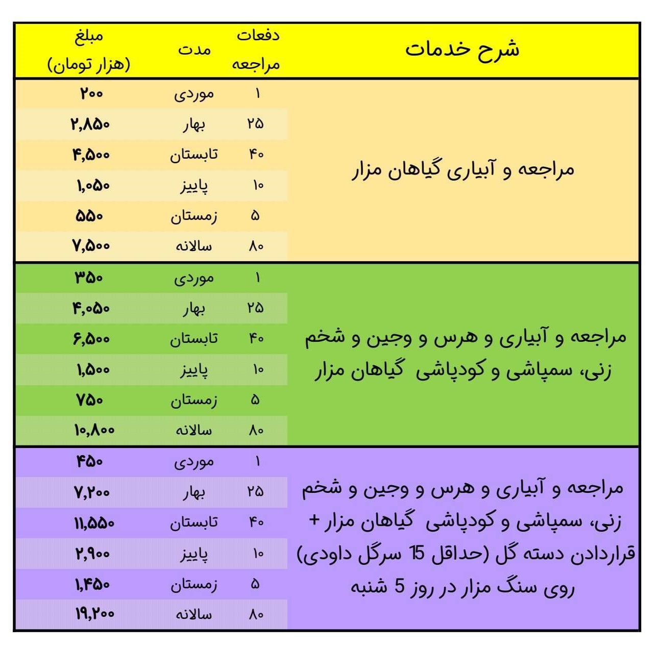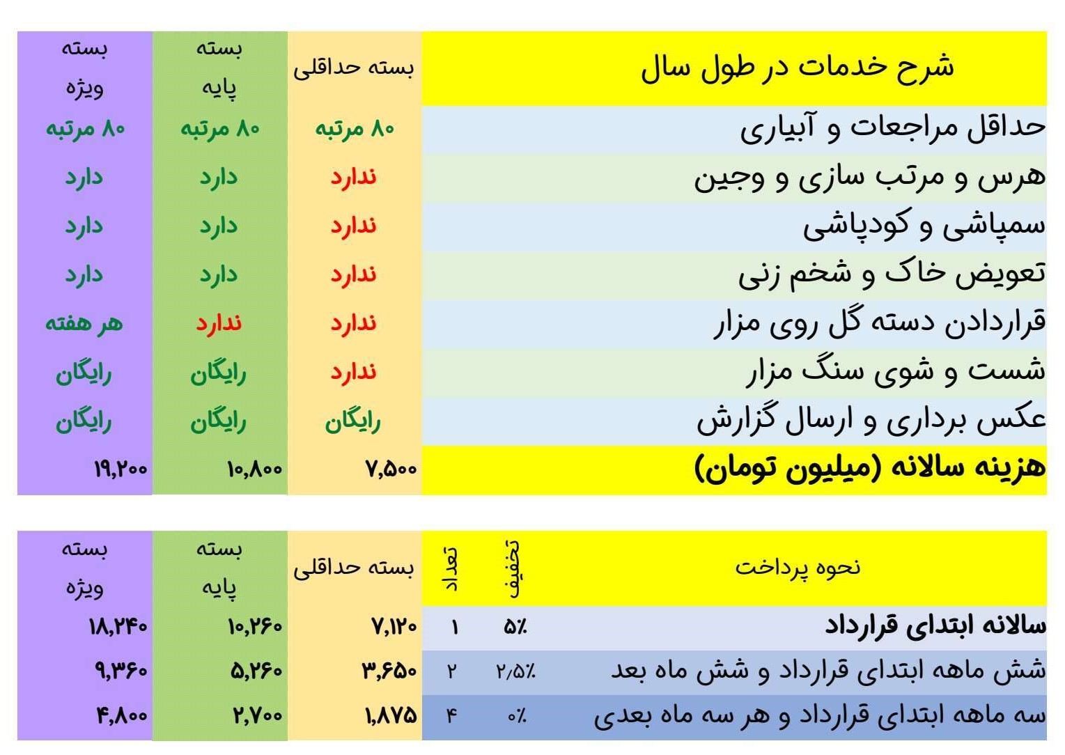 - خدمات به صورت سالانه میباشد و خدمات فصلی با توجه به فصل قرارداد هزینه های متفاوتی خواهند داشت